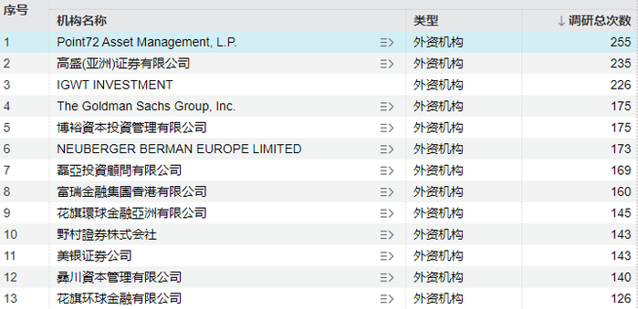 Wind数据显示,截至12月3日,今年以来外资机构合计调研A股上市公司9084次,其中被称为华尔街“最疯狂赚钱机器”的Point72资产管理公司调研255次,高居榜首。高盛、路博迈、花旗环球、美银证券等全球知名投行和顶级资产管理公司调研次数也均超过100次。