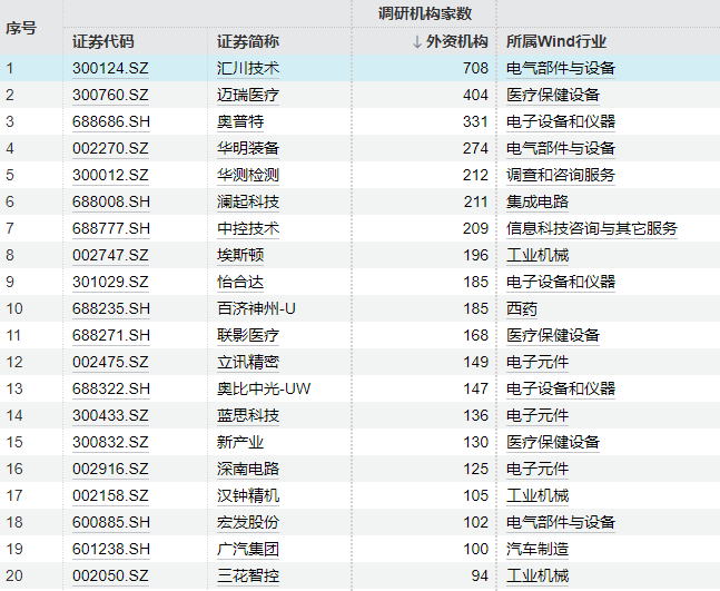 具体到调研标的,外资调研的方向主要聚焦于科技创新和高端制造两大赛道。其中,汇川技术以708家的外资机构调研数量位居首位;迈瑞医疗和奥普特分别以404家和331家次之,位列第二、第三。此外,华明装备、华测检测、澜起科技和中控技术也均吸引了超过200家外资机构前来调研。