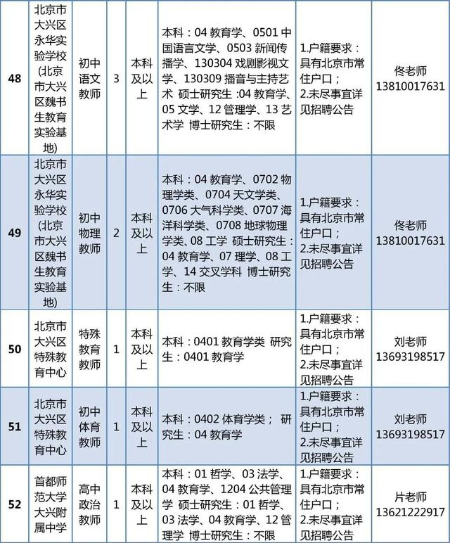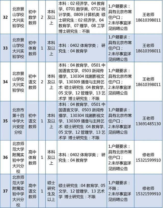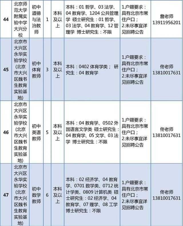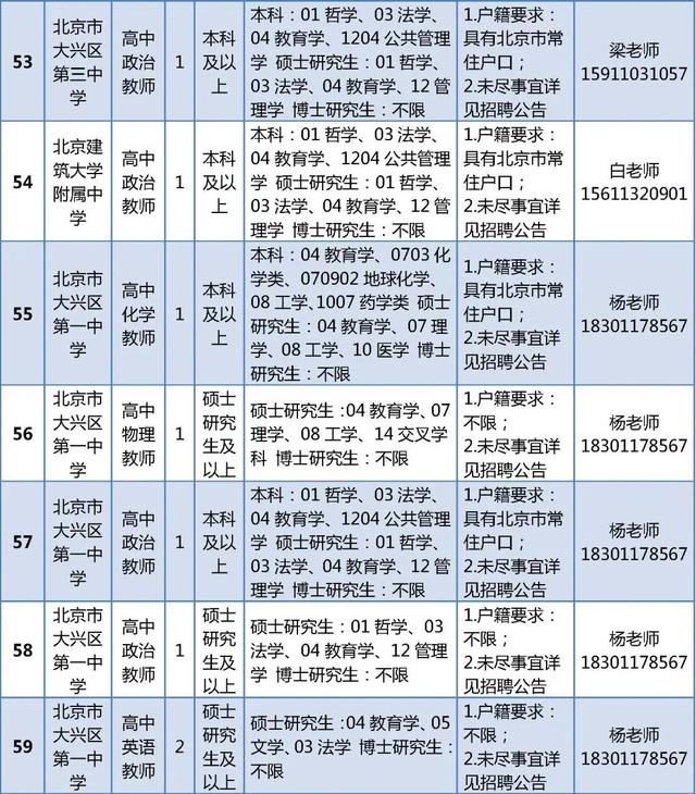 报考咨询电话:详见《北京市大兴区教委所属事业单位公开招聘教师岗位一览表》中各招聘单位联系方式(工作日:上午9:00—11:30,下午13:30—18:00)