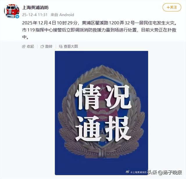 据@上海黄浦消防 官方最新通报:2025年12月4日10时29分,黄浦区瞿溪路1200弄32号一居民住宅发生火灾。市119指挥中心接警后立即调派消防救援力量到场进行处置,目前火势正在扑救中。