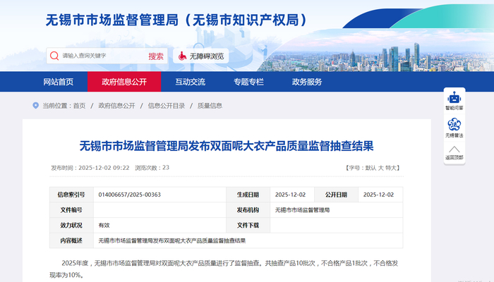 2025年度,无锡市市场监督管理局对双面呢大衣产品质量进行了监督抽查。共抽查产品10批次,不合格产品1批次,不合格发现率为10%。