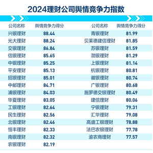 综合来看,2024年共5家银行理财机构在舆情维度总得分低于80分,分数从低到高分别是渝农商理财(77.57分)、法巴农银理财(77.78分)、高盛工银理财(78.88分)、汇华理财(79.08分)和宁银理财(79.31分)。