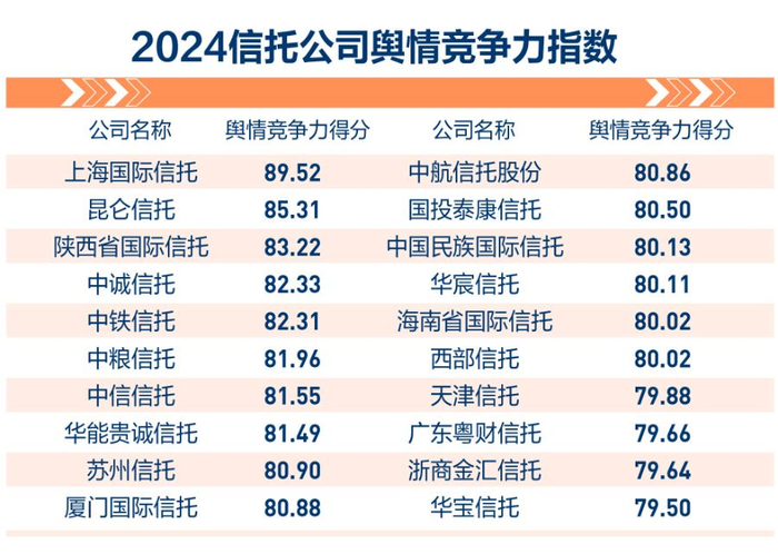 综合来看,2024年共有5家信托机构在舆情维度总得分低于70分,按得分从低到高排序依次为:雪松国际信托(62.30分)、华澳国际信托(63.28分)、民生信托(64.17分)、四川信托(67.38分)和国通信托(68.74分)。
