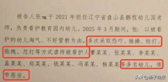 据盘锦市大洼区人民检察院的起诉书显示,被告人张某于2021年担任盘山县鹏程幼儿园教师,负责看护教育园内幼儿。2025年3月期间,张某以被看护的幼儿淘气、不好管教为由,多次采取恐吓、推搡、拍打拖拽、怼打等方式虐待多名幼儿,情节恶劣。