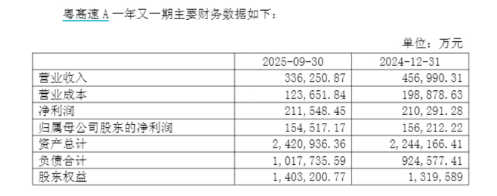 从核心财务数据看,粤高速A的具备稳定的盈利能力,属于优质资产。粤高速A 2024年营业收入45.70亿元,归属母公司股东净利润15.62亿元;2025年三季度虽受季节性影响营收降至33.63亿元,但归属母公司股东净利润达15.45亿元。