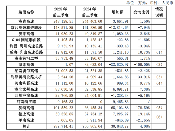 在山东高速的三季报中,作为营收压舱石的通行费收入,呈现“一增一降”的极端分化。通行费收入实现78.77亿元,同比增长4.08%。其中,济菏高速因改扩建完成、从四车道升级为八车道,该路产前三季度收入同比激增178.59%,成为唯一的高增长极。但需要注意的是,这种增长具有明显的一次性特征,通行量增长源于此前施工期间积压需求的释放,2026年起增速大概率回归常态。剔除该因素后,其他核心路产收入同比下降3.2%。