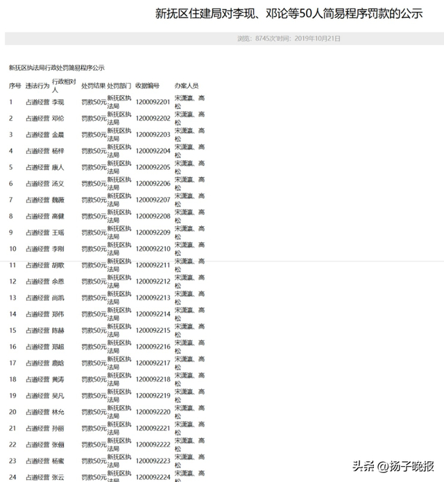 12月4日,有网友发现辽宁抚顺新抚区住建局于2019年10月21日公示的一占道经营处罚名单疑存猫腻,其上的名字不但均为“姓氏+单名”的两字结构,而且还不少与知名艺人重名,如李现、邓伦、金晨、董璇、杨颖等。