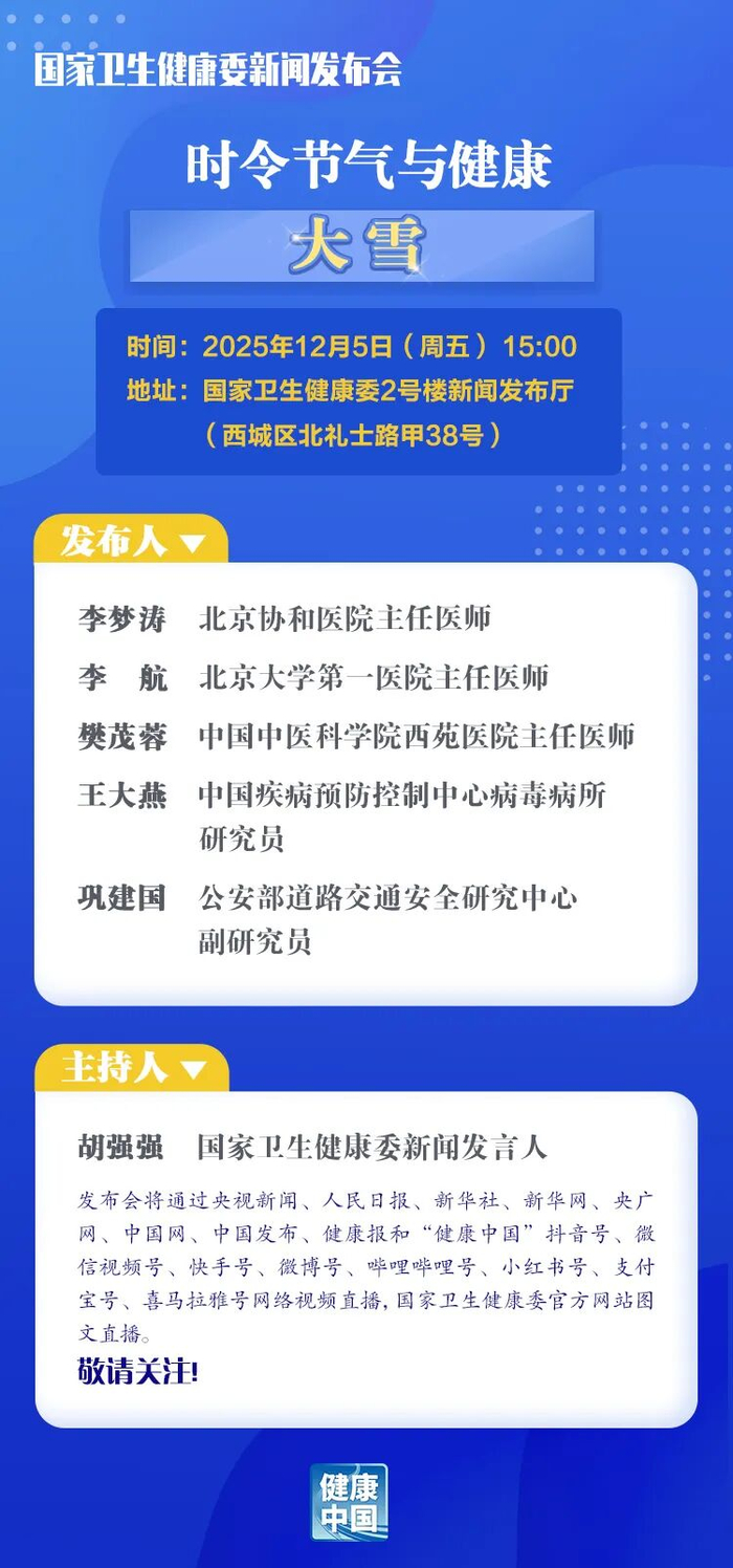 国家卫生健康委12月5日召开新闻发布会,介绍“时令节气与健康(大雪)”有关情况,直播入口→