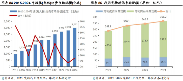 5.2.1国内市场稳步增长,中国粮黄金时代已来城镇宠物(犬猫)消费市场规模稳中有增,猫经济景气度向上。宠物行业白皮书(消费报告)数据显示:①2024年,我国城镇宠物(犬猫)消费市场规模3,002亿元,同比+7.5%,宠物食品消费市场占比52.8%,同比+0.5pct。其中,犬消费市场规模1,557亿元,同比+4.6%,食品市场占比50.1%,同比-0.3pct;猫消费市场规模1,445亿元,同比+10.7%,食品市场占比55.7%,同比+1.3pct。②城镇犬猫数量同比微增,单宠年均消费回升带动宠物消费市场扩容。2024年,我国宠物犬数量5,258万只,同比+1.6%,宠物猫数量7,153万只,同比+2.5%,增长趋势延续。2024年,单只宠物犬年均消费2,961元,同比+3.0%,单只宠物猫年均消费2,020元,同比+4.9%。头部企业积极推行品牌化与高端化战略,不断扩大市场份额,国产替代趋势日益显著。欧睿国际数据显示:2024年宠物食品TOP5品牌中,国产品牌占3席,宠物食品TOP3品牌中,国产品牌占2席,麦富迪持续两年成为我国宠物食品TOP1品牌,“中国粮”的黄金时代已然到来。宠物行业白皮书数据显示,近年来宠物主对于国产品牌偏好度持续提升,2024年偏好购买国产品牌犬主粮的宠物主占比达32.9%,同比提升5.8个百分点,偏好购买国产品牌猫主粮的宠物主占比达34.8%,同比提升6.5个百分点。