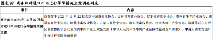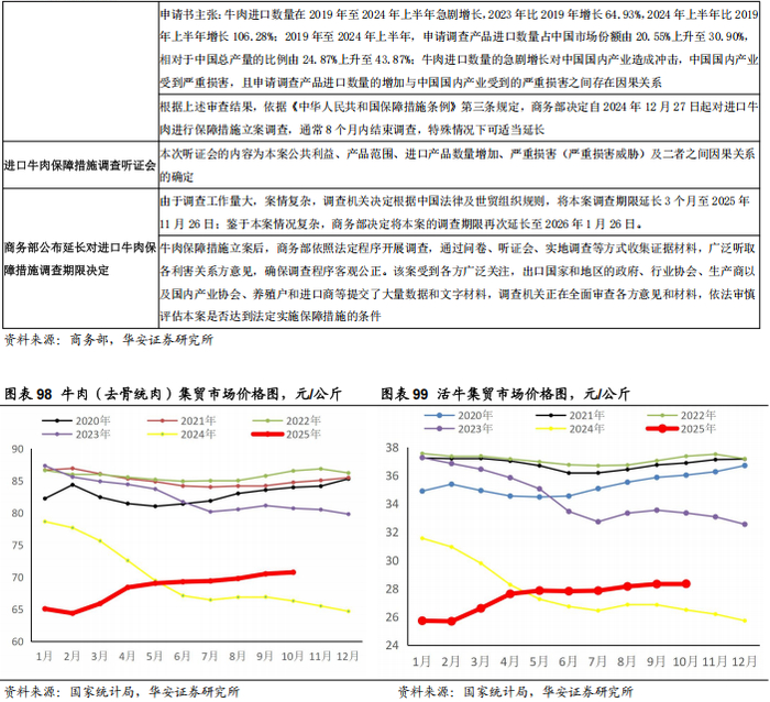 牛存栏下降一直以为是牛价大涨的先行指标:①2006-2008年牛期末存栏同比分别下降4%、1%、3%,2007年1月-2008年12月牛价大涨67%;②2010-2013年牛期末存栏同比分别下降2%、4%、3%、2%,2012年1月-2013年12月牛价大涨44%;③2018年牛期末存栏下降1%,2019年1月-2020年2月牛价大涨24%。我们认为这一波牛价大涨,主要是非瘟疫情造成猪肉严重供不应求所引发的。2024年6月,我国牛期末存栏量同比开始由升转降。2024年6月、2024年12月、2025年3月、2025年6月、2025年9月,牛期末存栏量同比分别-2.9%、-4.4%、-3.5%、-2.1%和-2.4%。2025年9月末,牛存栏量9,932万头,较2023年末已累计下降5.5%。