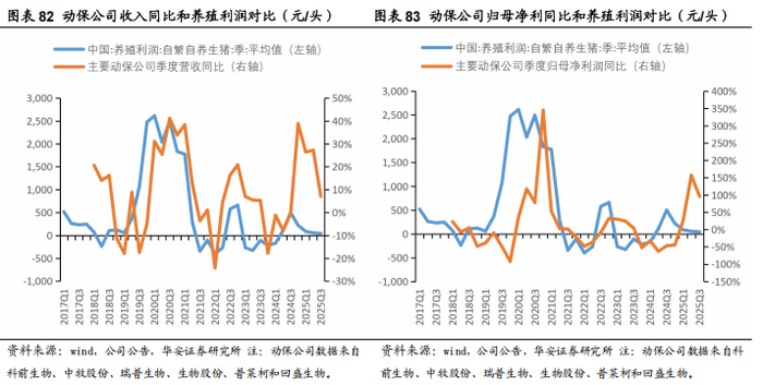 从历史经验来看,动保企业业绩相比养殖利润有一定滞后性,下游养殖企业持续盈利后约1-2个季度动保企业业绩会出现明显改善。2025年7月开始,生猪养殖行业步入去产能阶段,据统计局数据,2025Q3能繁母猪存栏量累计下降9万头,10月末全国能繁母猪存栏量降至4000万头以下,随着生猪养殖业全面亏损叠加调控政策持续落实,生猪行业去产能有望明显提速。从年度能繁母猪存栏推断,2026年下半年生猪价格有望逐步回暖,此外,上市猪企生猪养殖成本处于下行通道,头猪净利有望逐步上升,动保产品需求量或呈增长态势。