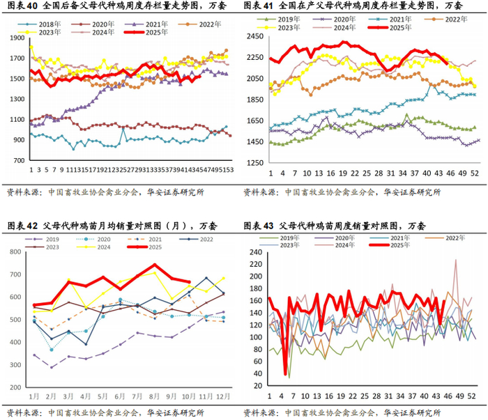 从种源情况看,在产父母代种鸡存栏已连续4年呈现持续减少趋势,2024年进一步跌破自2018年以来的最低值。鉴于2024年市场释放出的积极信号,2025年在产父母代种鸡规模反弹,高于2023-2024年同期水平,在产祖代种鸡存栏规模仍处于历史最高,我们预计2026年黄羽鸡产业链盈利相对平淡。
