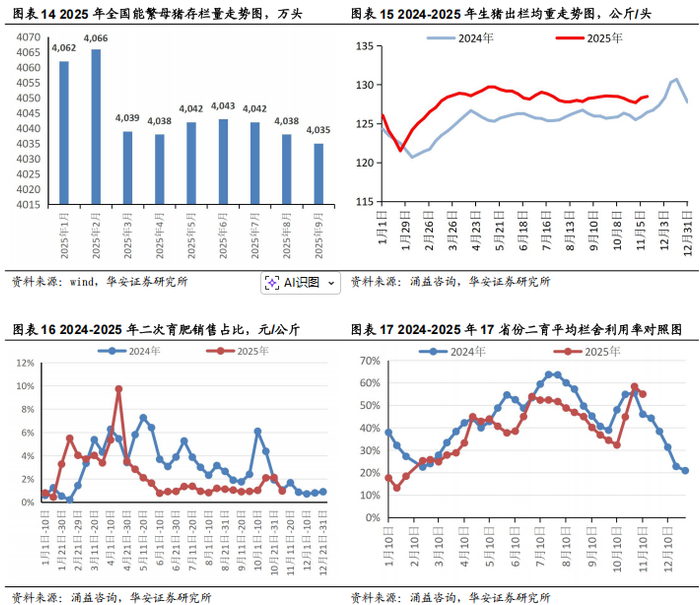 2025年5-8月,发改委释放稳定猪价信号,要求国内大型集团猪企停止增加能繁母猪存栏,出栏体重控制在120kg,且不鼓励二育销售。9月,农业部畜牧兽医局会同国家发改委价格司召开生猪产能调控企业座谈会,主要举措包括:25家头部猪企需于近期上报减产计划,年内减少能繁母猪存栏100万头;各省份也需要调减能繁母猪,省份调减任务与头部企业产能调减任务有重合。本次会议较前几次明显加码。截至9月末,全国能繁母猪存栏量4,035万头,较4月末仅下降3万头,政策影响有望在Q4逐步显现,2025年10月末,能繁母猪存栏量降至4000万头以内。出栏均重持续高于2024年同期,6月以来生猪均重始终稳定在127.69公斤以上;二次育肥销售占比维持相对低位,10-11月17省份平均栏舍利用率出现快速反弹。