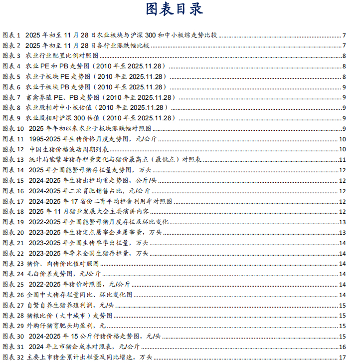 2025年初至11月28日,农林牧渔(申万)指数+18.19%,沪深300指数+15.04%,中小板综指数+26.64%,农业板块跑赢沪深300指数3.15个百分点,跑输中小板8.45个百分点;农林牧渔在申万31个子行业中涨幅排名第11位。