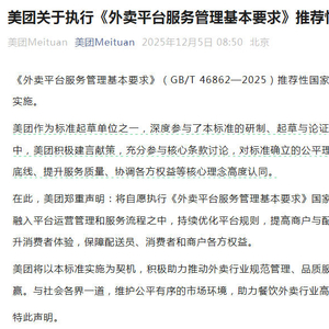 中新经纬12月5日电 日前,淘宝闪购、美团、京东外卖相继发布执行《外卖平台服务管理基本要求》推荐性国家标准的声明。
