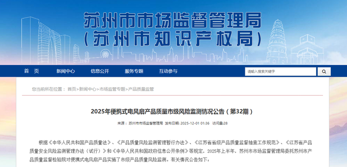 中国质量新闻网讯 近日,江苏省苏州市市场监管局网站公布2025年便携式电风扇产品质量市级风险监测情况(第32期)。