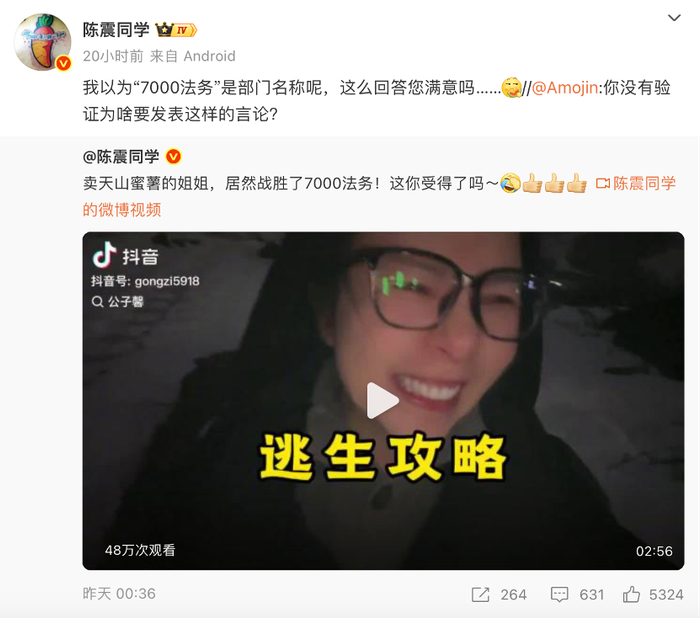 12月4日当天,陈震曾转发“卖蜜薯姐姐战胜7000法务”视频并配文调侃,被指影射小米。