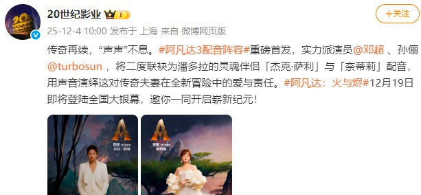 12月4日,20世纪影业官方微博官宣《阿凡达3》配音: