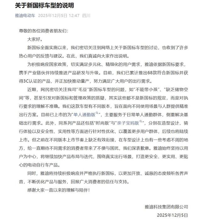 近期,网民密切关注我司“毛豆”新国标车型的问题,如“不能带小孩”“缺乏储物空间”等,甚至引发对新国标和管理政策的质疑,其实这些都不是新国标的规定,而是对执行要求的理解不准确。我们这款车型有不同版本,旨在面向不同使用场景与人群提供精准出行方案。目前已上市的为“单人通勤版”,主要服务于日常单人通勤群体,侧重解决基础出行需求。此外,同系列产品还包括“时尚版”与“亲子宝妈版”,分别在造型设计、骑行体验以及安全性、实用性等方面进行针对性优化,以覆盖更多用户群体,后续也将陆续上市。但之前在不同版本上市节奏上缺乏有效衔接,在车型设计上也有一些考虑不周的地方,给一直期待不同需求的消费者带来了不便与困扰,我们深表歉意。雅迪始终坚持以用户为中心,将继续加快产品布局与迭代,围绕真实出行场景,打造更安全、更实用、更贴心的电动自行车产品。