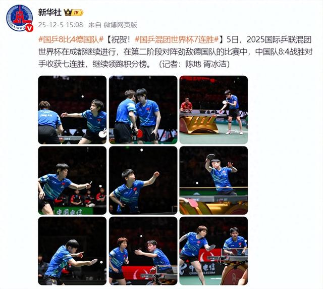 祝贺!国乒混团世界杯7连胜 环球网 环球网官方账号 2025.12.0515:11 关注 5日,2025国际乒联混团世界杯在成都继续进行,在第二阶段对阵劲敌德国队的比赛中,中国队8:4战胜对手收获七连胜,继续领跑积分榜。(记者:陈地 胥冰洁)