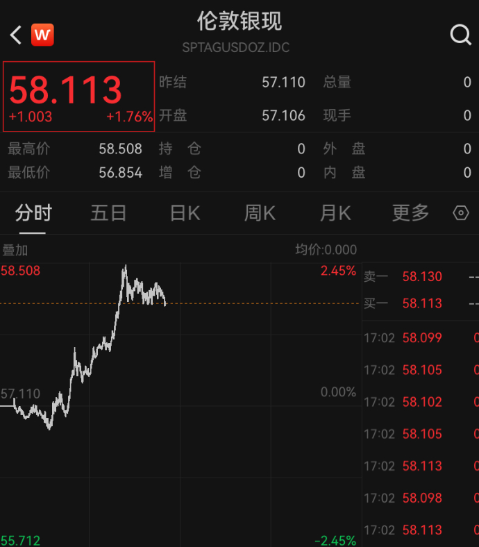 12月5日白银价格再度大涨,截至发稿,报58.11美元/盎司,日内涨幅1.76%。