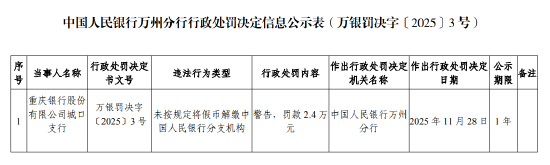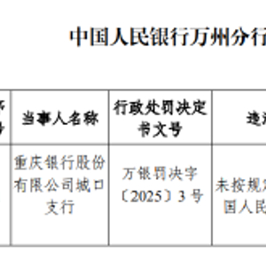 重庆银行城口支行被罚2.4万元:未按规定将假币解缴中国人民银行分支机构 金融一线 2025.12.0521:23 关注 12月5日金融一线消息,据中国人民银行万州分行行政处罚决定信息公示表显示,重庆银行股份有限公司城口支行因未按规定将假币解缴中国人民银行分支机构,被警告,罚款2.4万元。
