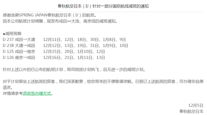 记者注意到,春秋航空虽然没有发布免费退改政策,但是已经提前公告明年部分航班的减班信息。