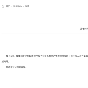 通报称,集团关注到网络对控股子公司浙商资产管理股份有限公司工作人员许某等人的相关信息。此前,集团已接到相关举报,并于11月17日监察立案调查,三人目前已停职,将根据调查结果依法依规处理。感谢社会公众的监督。