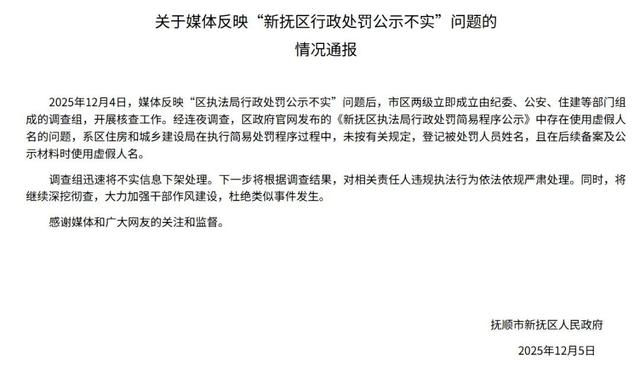 12月5日,抚顺市新抚区人民政府发布关于媒体反映“新抚区行政处罚公示不实”问题的情况通报。