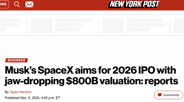 马斯克旗下SpaceX计划于2026年上市,估值高达8000亿美元