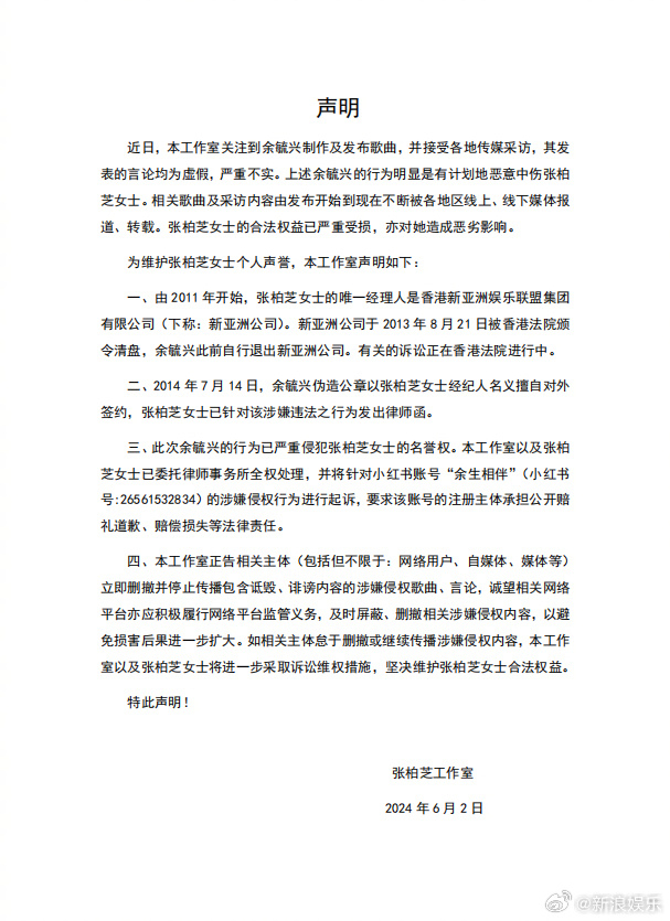 对此@张柏芝工作室 发布声明回应,称余毓兴歌曲及相关言论均为虚假,严重不实,张柏芝已委托律师对侵权行为进行起诉。此外,余毓兴还曾在2014年伪造公章以张柏芝经纪人名义擅自对外签约,张柏芝已就该行为发出律师函。
