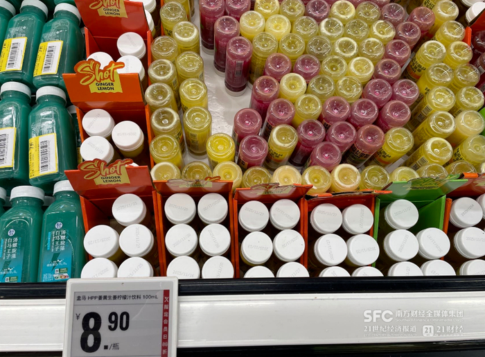 12月4日,21世纪经济报道记者走访发现,盒马的这款姜黄饮被摆放在超市门口最显眼的位置。一瓶100毫升的盒马姜黄饮标价8.9元,而旁边300毫升的复合果汁饮料,卖7.9元还贴上了打七折的标签。