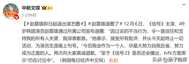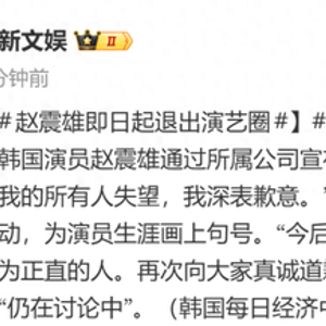 12月6日,《信号》主演、49岁韩国演员赵震雄通过所属公司宣布退圈:“因过去的不当行为,令一直信任和支持我的所有人失望,我深表歉意。”他表示,接受所有批评,并从今天起终止一切活动,为演员生涯画上句号。“今后我会作为一个人,尽最大努力自我反省,努力成为正直的人。再次向大家真诚道歉。”