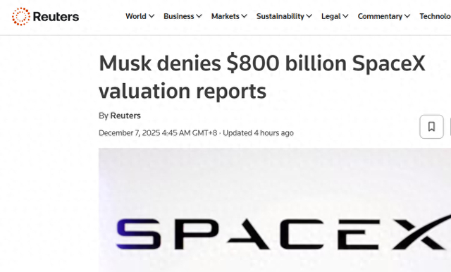 【环球网科技综合报道】12月7日路透社报道,特斯拉CEO埃隆・马斯克通过个人社交平台发声,直接驳斥了近期引发热议的 “SpaceX 正以 8000 亿美元估值开展融资”的传闻,明确指出相关消息存在偏差,引发行业广泛关注。
