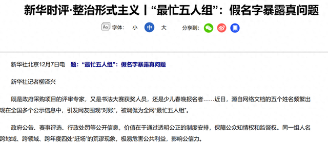 同在12月7日,《新华每日电讯》发表了题为《“全网最忙五人组”背后藏了什么“鬼”?》的评论。文章梳理道,这些名字在不同的官方文件、公示场合中反复出现,暴露的不只是低级错误或工作疏忽,而是部分公共事务流程中因为系统性、结构性的形式主义,导致了程序空转、责任虚化、审核失效、监管缺位等深层次问题。