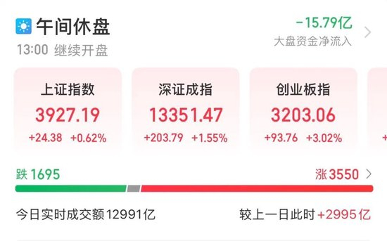 12月8日早盘,A股市场震荡反弹,算力硬件股集体大涨,助推创业板指拉升超3%。截至午间收盘,上证指数报3927.19点,涨0.62%;深证成指、创业板指分别涨1.55%、3.02%。沪深北三市半日成交12991亿元,较上日同期放量2995亿元;CPO概念三大龙头新易盛、中际旭创、天孚通信(“易中天”)成交额均超百亿元,排名全市场前三。
