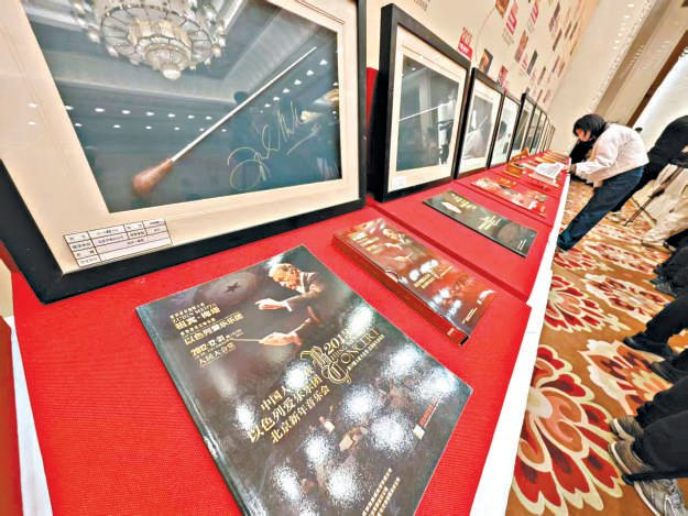 活动现场展示历届北京新年音乐会的“老物件”——节目册、老照片、演出视频、签名指挥棒、《红旗颂》集锦CD等。本报记者 方非 摄