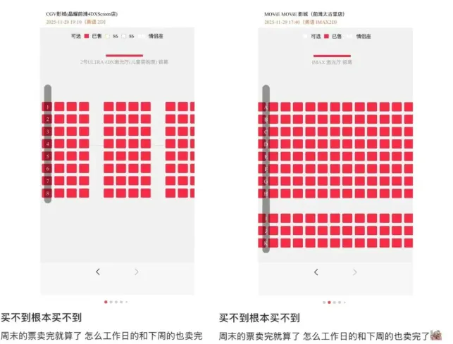 还有网友称,多个影院多个时段的票“买不到根本买不到”。