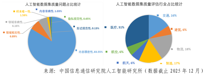 评估实践方面,中国信通院自2024年12月正式发布“可信AI”人工智能数据集质量评估体系1.0后,目前已完成招商局集团、中国建筑、中国物流、中国中车、中国东方航空、中国航天科技集团、中国电信、国家呼吸医学中心等10余家重点行业央企与国家级实验室案例,涵盖文本、图片、多模态等模态,涉及交通、物流、建筑、制造、航空、航天等行业领域。经过测试发现目前高质量数据集面临内容稠密性、领域相关性、领域准确性、样本唯一性、内容准确性等核心问题,具体结果与趋势如下。