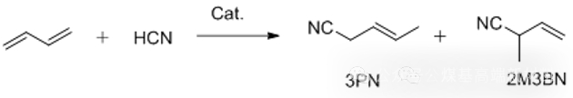 这套工艺的核心逻辑可分为三步:第一步,丁二烯与氢氰酸在高温、催化剂作用下生成3-戊烯腈和2-甲基-3-丁烯腈,未反应的丁二烯经减压回收后循环利用,两种产物通过精馏分离;第二步,将分离出的2-甲基-3-丁烯腈异构化为3-戊烯腈,最大化目标中间体产量;第三步,3-戊烯腈再次氰化生成己二腈,最终经精制得到合格产品。整个流程实现了原料的高效利用与产物的精准控制,尽显工艺先进性。