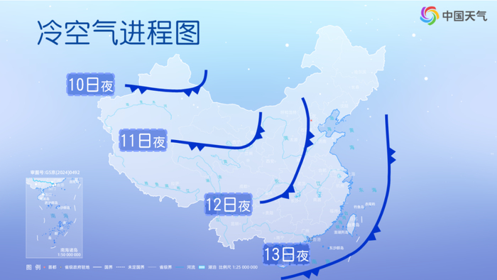从降温进程来看,10日主要影响新疆,11日影响西北和华西地区,12日影响中东部地区,13日影响东北及南方地区。此次寒潮过程最低气温0℃线将抵达江南北部,较上一轮寒潮过程偏南。