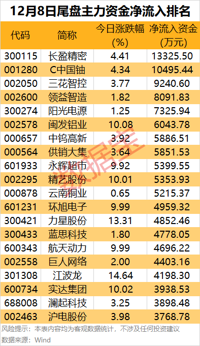 长盈精密和C中国铀尾盘主力资金净流入金额均超1亿元,涨幅均在4%以上。