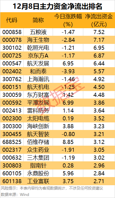 五粮液主力资金净流出7.52亿元,居首。中国商报报道,五粮液将从明年起调整第八代五粮液产品的价格,在1019元/瓶打款价不变的基础上,给予打款折扣119元/瓶,即开票价为900元/瓶。