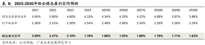 最后从净投资收益率到总投资收益率,一是公开市场权益占比从12%比例逐渐提升,假设2025年为16%2027-2030年为18%;二是过去稳态资本利得假设为5%,由于增量资金持续入市,我们假设2025-2030年权益资本利得为6%,则稳态总投资收益率从2024年的4.3%保持相对稳定,但随着净投资收益率的下降而下滑至4%左右,2025-2030年稳态总投资收益率平均水平为4.1%