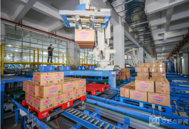 恒安新型生活用品智能化生产基地,机械臂将产品码放整齐,并通过自动化输送系统运送到指定仓储位置。