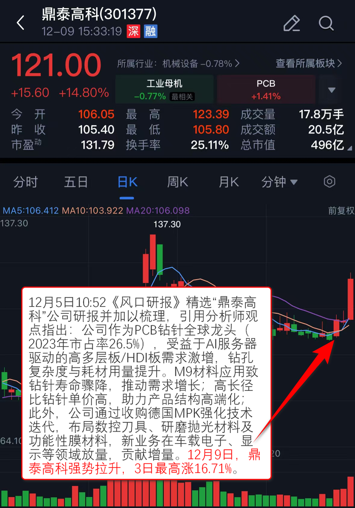 12月5日10:52《风口研报》精选“鼎泰高科”公司研报并加以梳理,引用分析师观点指出:公司作为PCB钻针全球龙头(2023年市占率26.5%),受益于AI服务器驱动的高多层板/HDI板需求激增,钻孔复杂度与耗材用量提升。M9材料应用致钻针寿命骤降,推动需求增长;高长径比钻针单价高,助力产品结构高端化;此外,公司通过收购德国MPK强化技术迭代,布局数控刀具、研磨抛光材料及功能性膜材料,新业务在车载电子、显示等领域放量,贡献增量。12月9日,鼎泰高科强势拉升,3日最高涨16.71%。