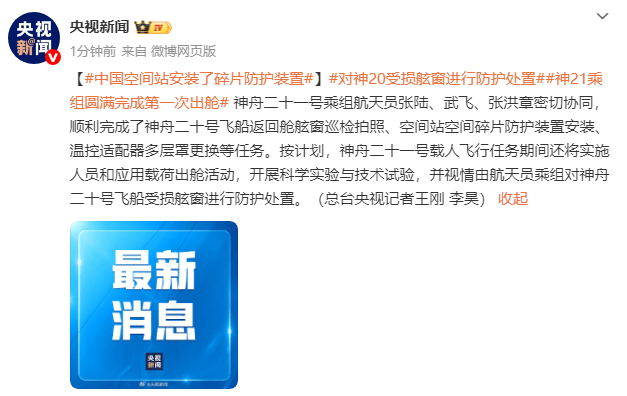 神舟二十一号乘组航天员张陆、武飞、张洪章密切协同,顺利完成了神舟二十号飞船返回舱舷窗巡检拍照、空间站空间碎片防护装置安装、温控适配器多层罩更换等任务。按计划,神舟二十一号载人飞行任务期间还将实施人员和应用载荷出舱活动,开展科学实验与技术试验,并视情由航天员乘组对神舟二十号飞船受损舷窗进行防护处置。(总台央视记者王刚 李昊)