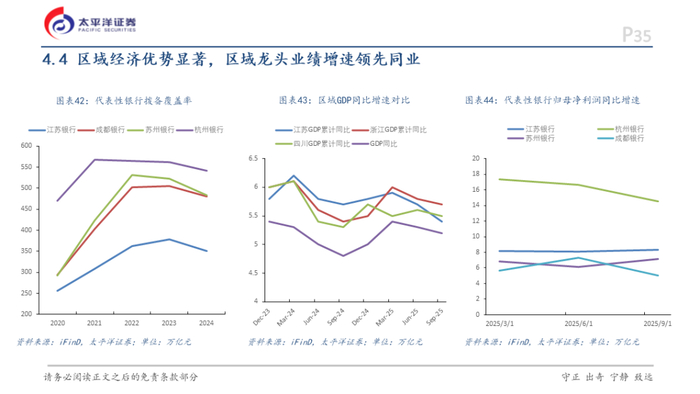 5)业绩成长性:区域城商行兼具卓越的业绩成长性、优异的资产质量与坚实的区域经济基础,长三角地区增速显著领跑行业。资产质量方面,代表性银行的不良贷款率均低于1.5%。其中,成都银行不良率仅0.66%,拨备覆盖率均超300%,风险抵补能力突出。这些银行深耕的长三角、成渝地区2025年上半年GDP增速均超5%、显著高于全国水平,旺盛的信贷需求与健康的信用环境为其持续成长提供了底层支撑。