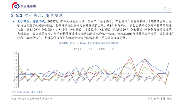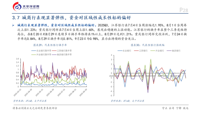 2)从板块基本面观察,银行股业绩已呈现持续改善态势。2025年9月,上市银行营业收入进一步攀升至4.32万亿元,同比增长0.90%,较2024年同期增速提升1.94个百分点;归母净利润达1.68万亿元,同比+1.46%,较2024年同期增速+0.01个百分点,盈利修复趋势明确。回溯2024年末至2025年上半年银行股的独立行情,当前市场环境与当时均处于科技板块大幅上涨后的估值高位,银行板块均呈现低估值、高股息特征,且基本面均处于改善通道。不同的是,当前银行板块估值更低,业绩改善趋势更为明确,而政策端对"城市更新"和房地产发展新模式的支持更为积极。基于市场风格轮动规律、估值比较优势以及基本面持续改善等多重因素,四季度银行股重演上涨行情具有较高概率,优质区域银行和高股息大行均有望获得资金青睐。
