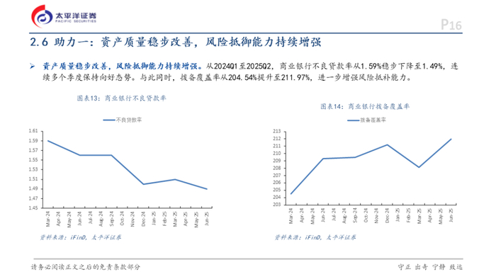 4)板块基本面:资产质量稳步改善,从2024Q1至2025Q2,商业银行不良贷款率从1.59%下降至1.49%,拨备覆盖率从204.54%提升至211.97%。信贷投放表现强劲,截至2025Q1末,人民币贷款余额同比增长7.4%,其中1月环比大幅增长1.99%。同时,上市银行通过提升分红比例与推行中期分红机制提振投资者回报,2025年6月分红比例19.19%,9月分红比例9.18%,同比均有提升,现金分红总额有望再创纪录。